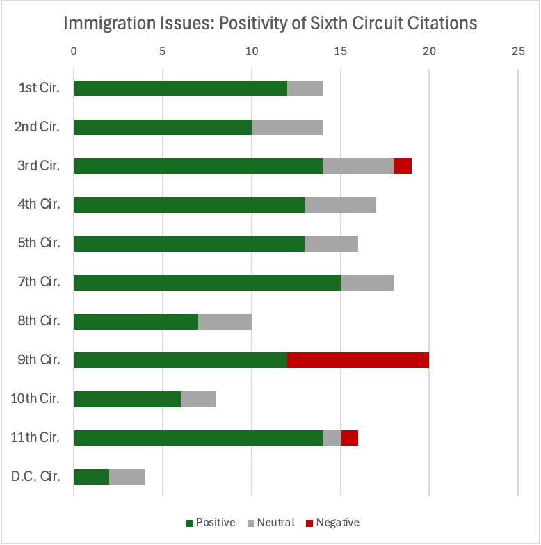 In my last piece, When Does a Sister Circuit Persuade?, I examined how the Sixth Circuit treats Ninth Circuit authority across doctrinal areas. Immigration stood out immediately. When the Sixth Circuit cited the Ninth Circuit in immigration cases, nearly half of those citations were negative.