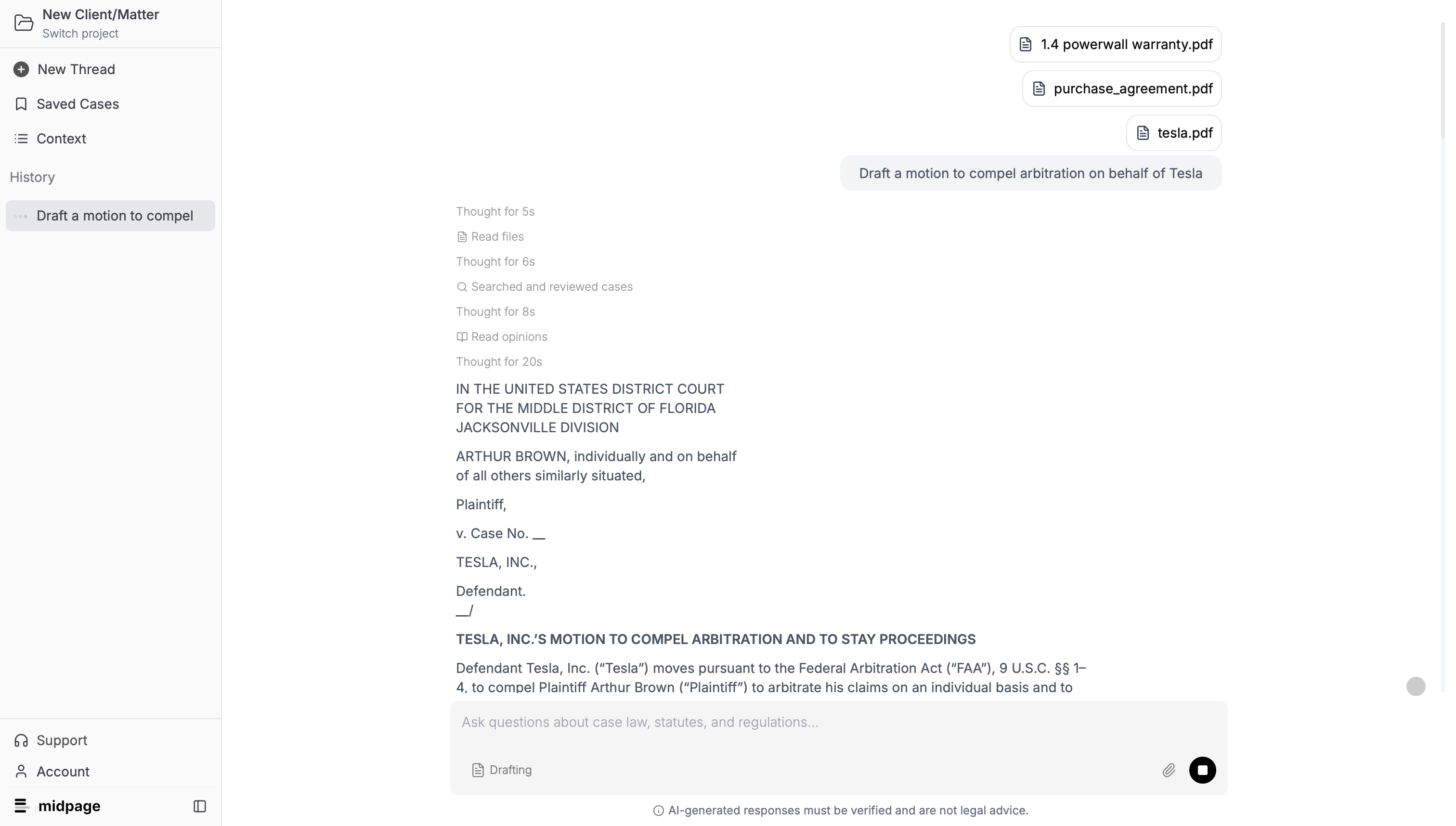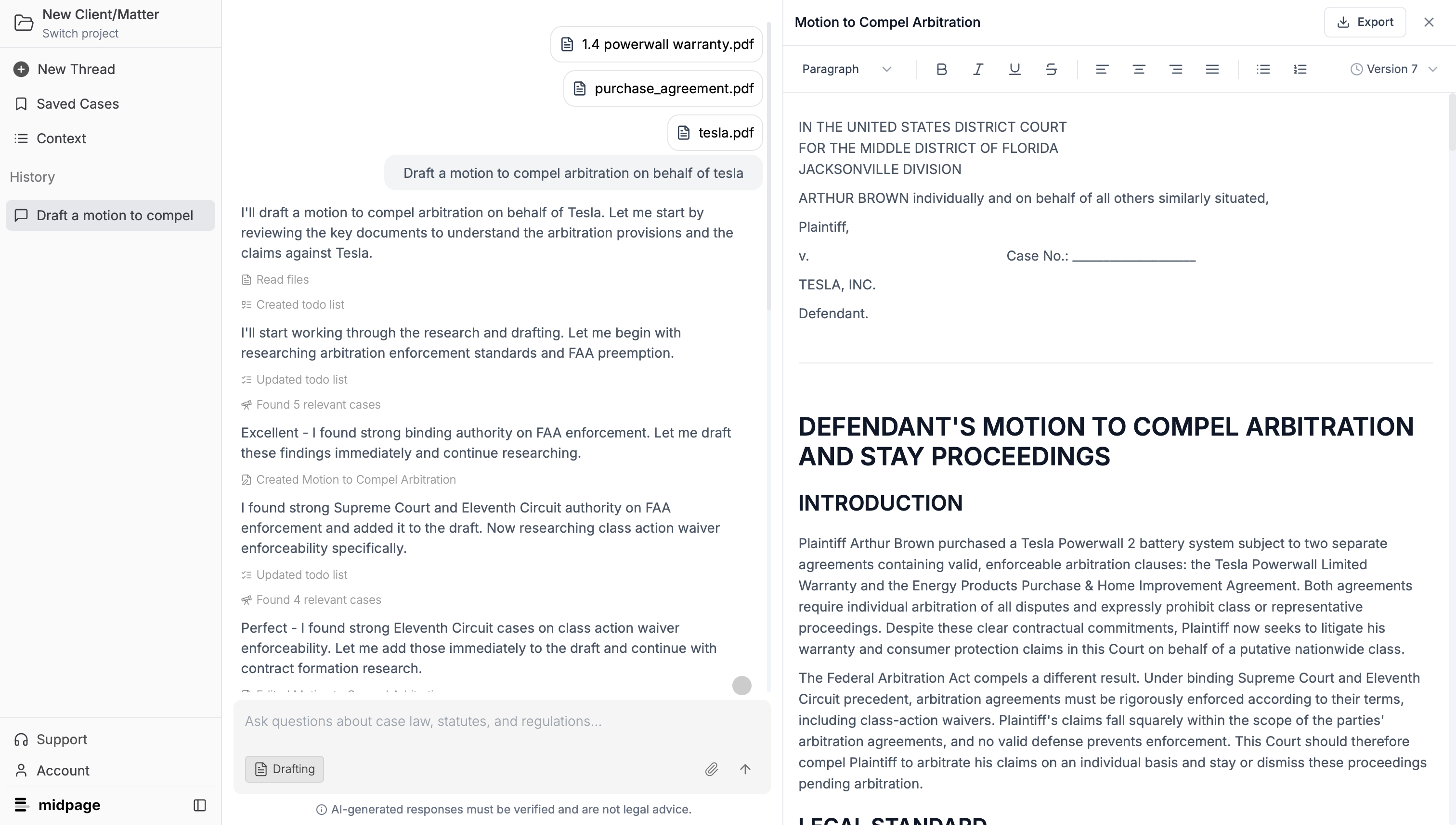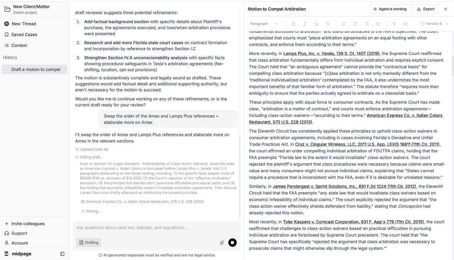 Midpage can now draft briefs. An agent you can iterate and collaborate with on work product, grounded in case law.
