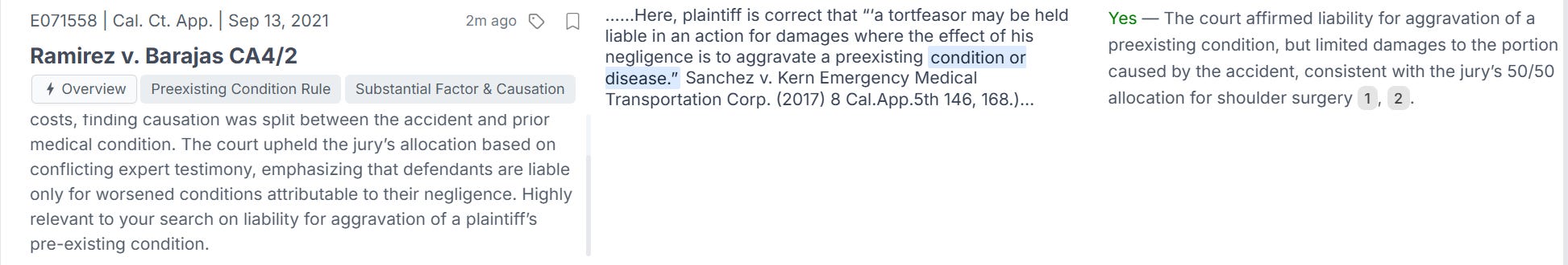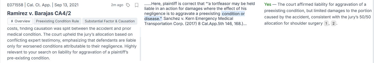 One case stands out: Ramirez v. Barajas CA4/2. The AI summary highlights that the court reaffirmed the jury’s apportionment of damages, finding sufficient evidence for a 50/50 split in causation between defendant’s negligence and the pre-existing condition.