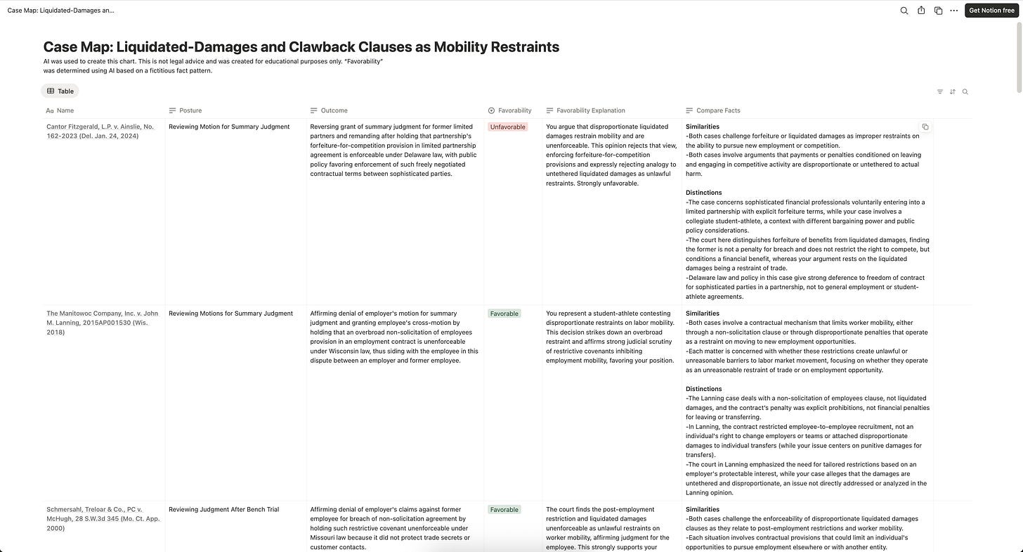 I added them to my Midpage notebook and created columns that answer litigation questions: posture, outcome, favorability, and factual similarity. Multi-column filtering made it easy to identify which favorable cases were closest to my hypothetical fact pattern and to surface the unfavorable cases I’d need to distinguish.